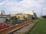 The Oliver rubber company building. This company was the last customer of this spur and used rail service until the early 2000's when they switched to trucks. Spur can be seen to the left. |