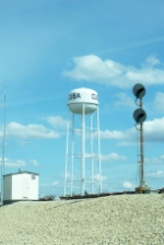 The Cuba, MO, water tower, plus a small building and signal. |