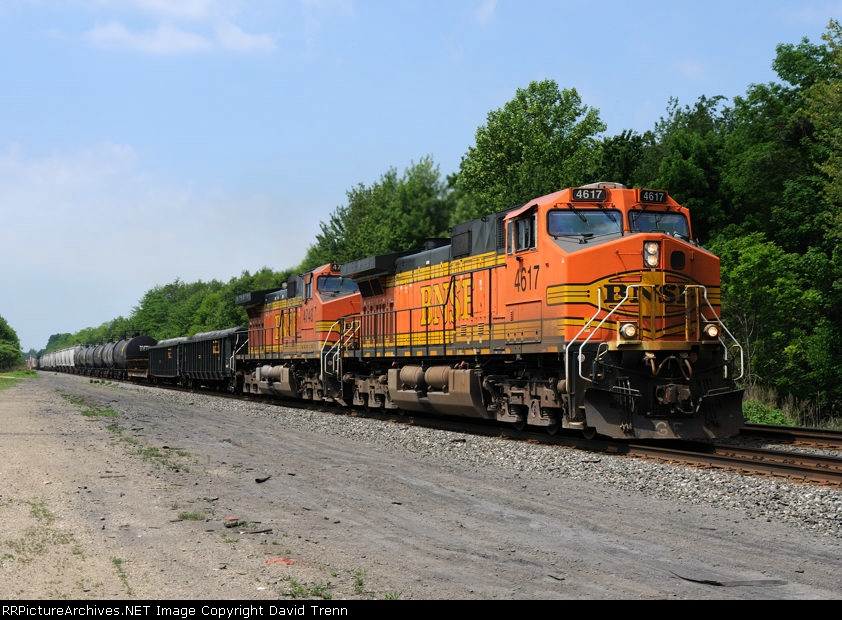 BNSF 4617 leads Eastbound CSX Q380 at MP QD120 on track number two.