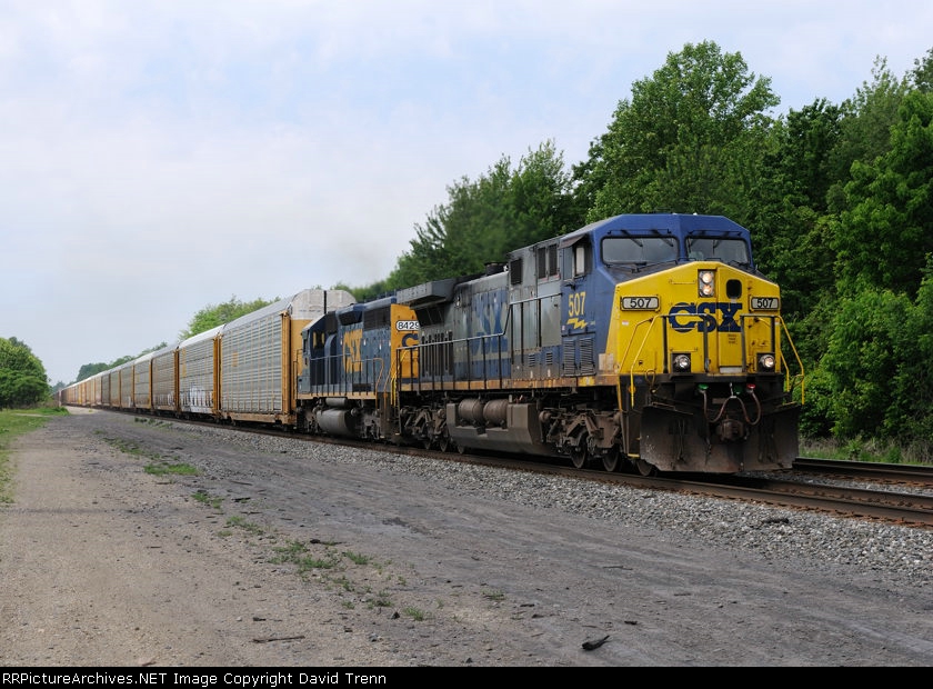 CSX 507 leads Eastbound CSX Q264 at MP QD120 on track number two.