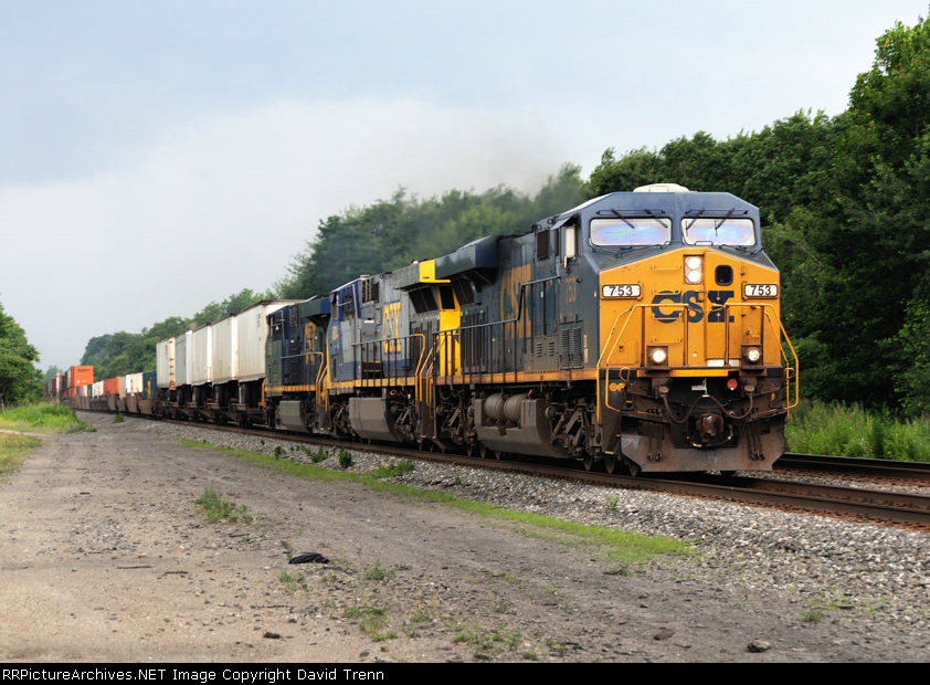 CSX 753 leads Eastbound CSX Q108 at Harmon Rd MP 120 on track number two.