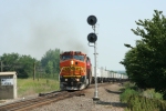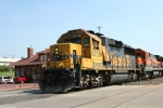 GUTHRIE OK March 26 1979 -- Santa Fe CF7 2455 handles switching duties in this one-time capital of Oklahoma. The crew has tied it up just south of the station. EMD built this unit (s/n 13787) in May 1951 as F7A 252L and delivered it in blue with cream and vermillion trim paint. On June 7 1977 the Cleburne TX shops rebuilt it as a CF7 in blue with yellow warbonnet and renumbered it 2455. It was retired in early 1982, sold to Southwestern Rail Car Parts in January 1983 and scrapped. (Roster information from http://atsfrr.net/resources/CrossetGene/master_diesel_roster/CF7/reference.htm)