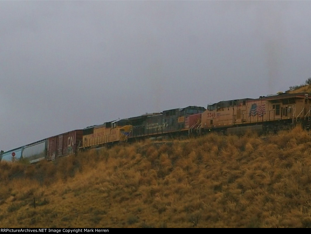 With the Horseshoe Curve behind it UP-5607 West climbs the grade out of the valley from Durkee, Oregon.