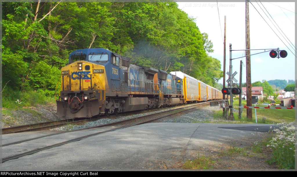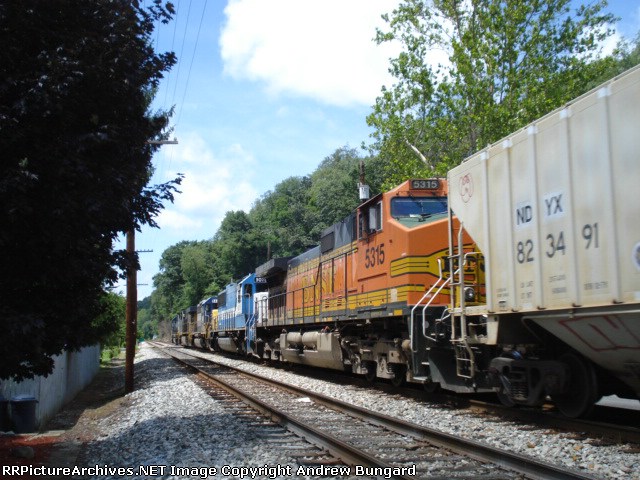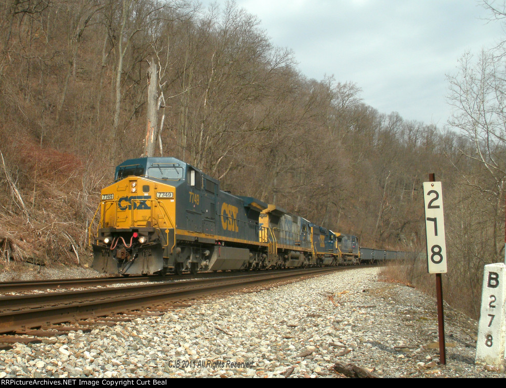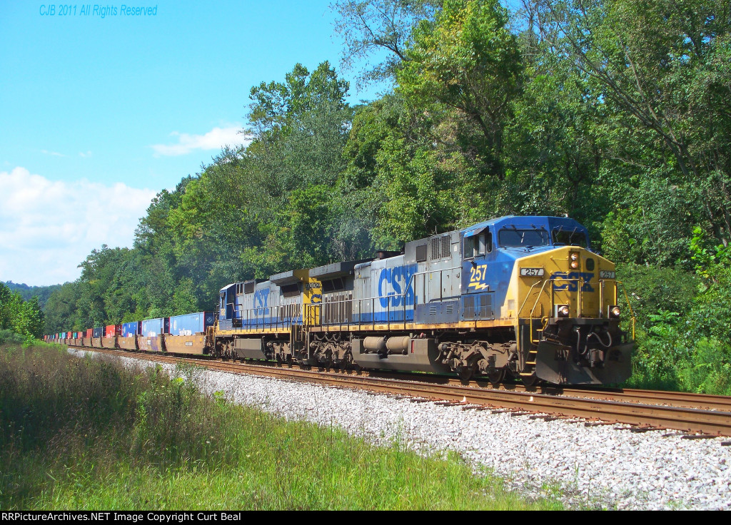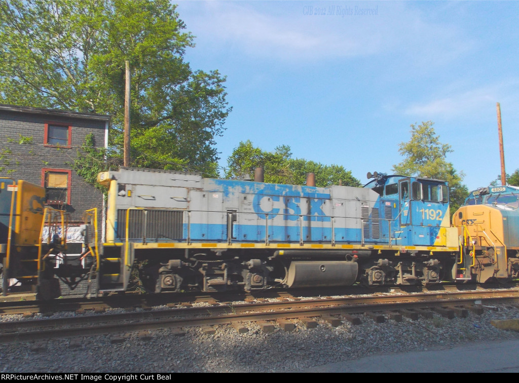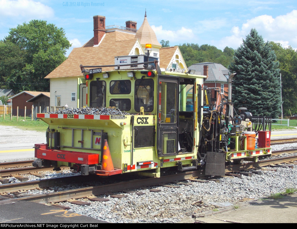 Plasser-American 09-16 DYNA-CAT continuous action tamper. Length 86' 6", width 10' 6", height 12', weight 153,500 pounds, wheel diameter 28", engine power 525 hp, travel speed 45 mph. One of 43 assorted on-track vehicles doing a tie-replacement blitz in the area of Dawson, PA on the CSX Keystone Subdivision. This was the largest one of them all, and was towards the rear of the convoy.