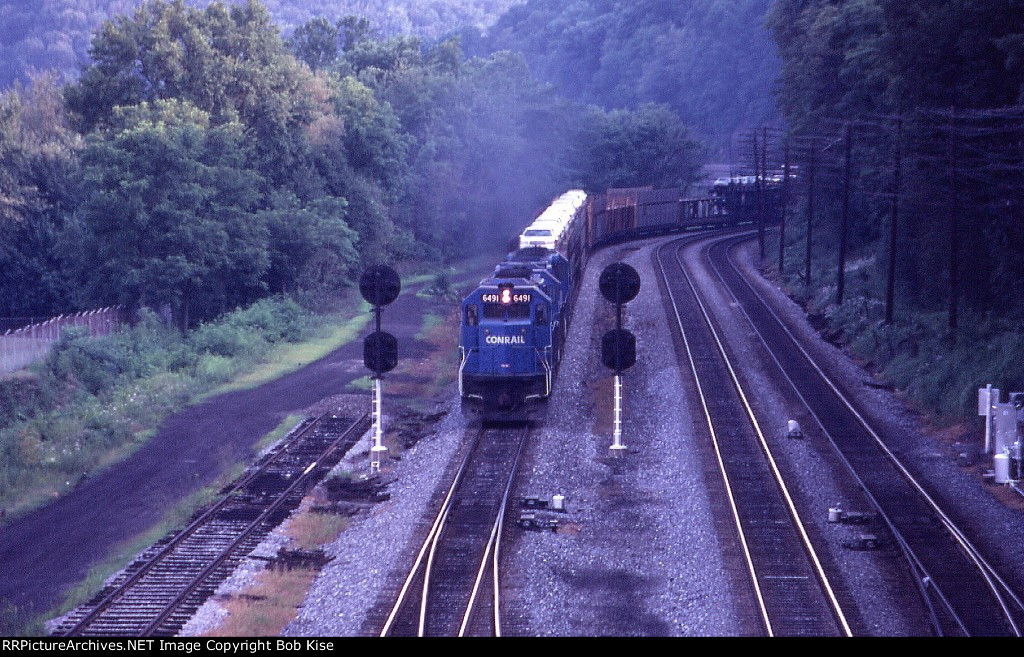 Mann. Here is a duplicate 35mm color slide by an unidentified photographer that was taken in Mifflin, Pennsylvania, c. 1967. Shown here (L to R) are Pennsylvania Railroad engines #6060 and #6505. #6060 is an EF-30A built by GM-EMD in February of 1966 and rated at 3,000 horsepower, while #6505 was constructed by GE in April of 1965 and rated at 2,500 horsepower. In this context, they're rockin' 'n' rollin' past MIFFLIN Tower with a freight train bound for the Enola Yards. ("PrrFan18n")
