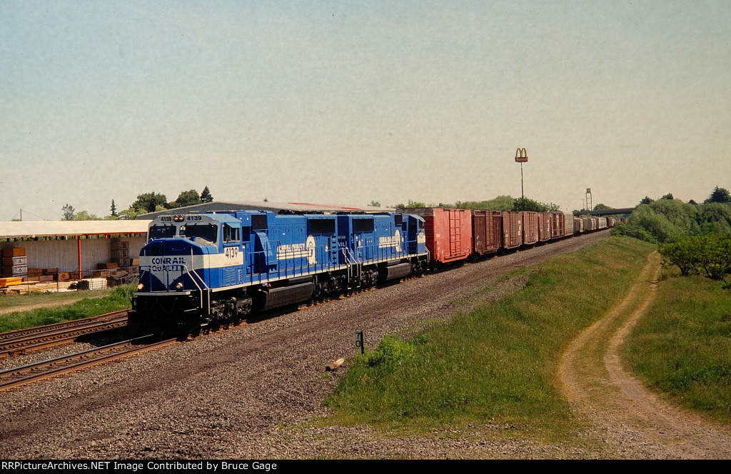 ELBUs counterpart, BUEL, left Buffalo this morning and is now 75 miles into the trip as it passes under a local bridge near the NY-PA line. The effort required to move the 138 cars is evident, as only the 6000 HP of three GP 38's is enough to get the train over the road.