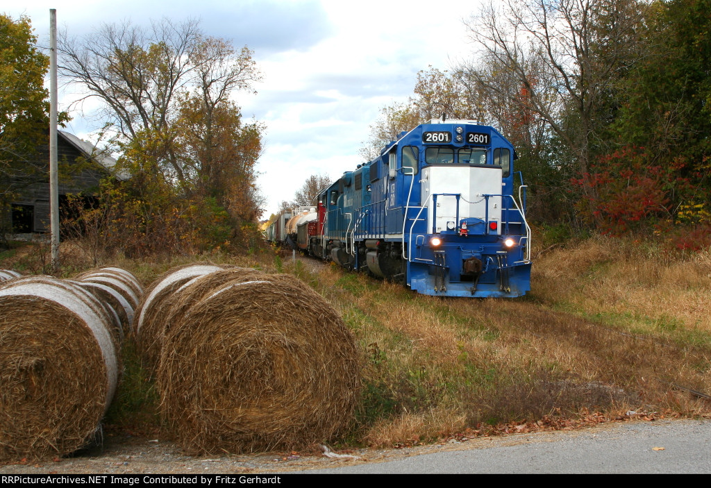 VTR southbound BDRD passes round bales and an old barn near the old station site at Salisbury, Vermont. Today's train consists of NTZR GP38-2 2601, GMTX GP38-2 2205, VTR GP38-3 206, and 30 cars of mixed freight.