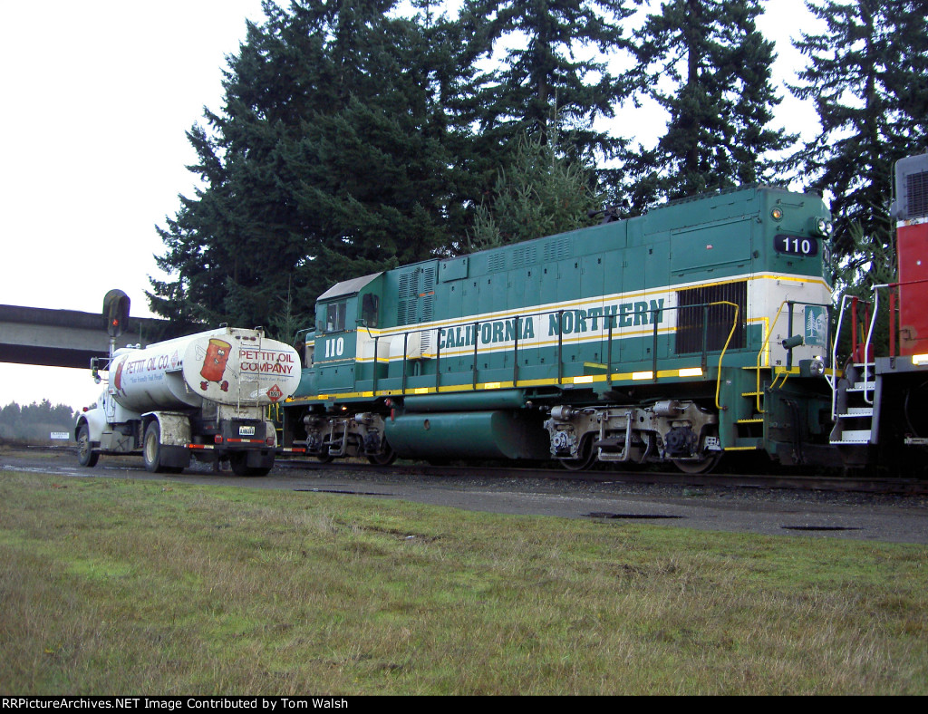 Cal Northern #110 tied down for the night at Blakeslee JCT Centralia, WA, with a fuel truck on hand and waiting.