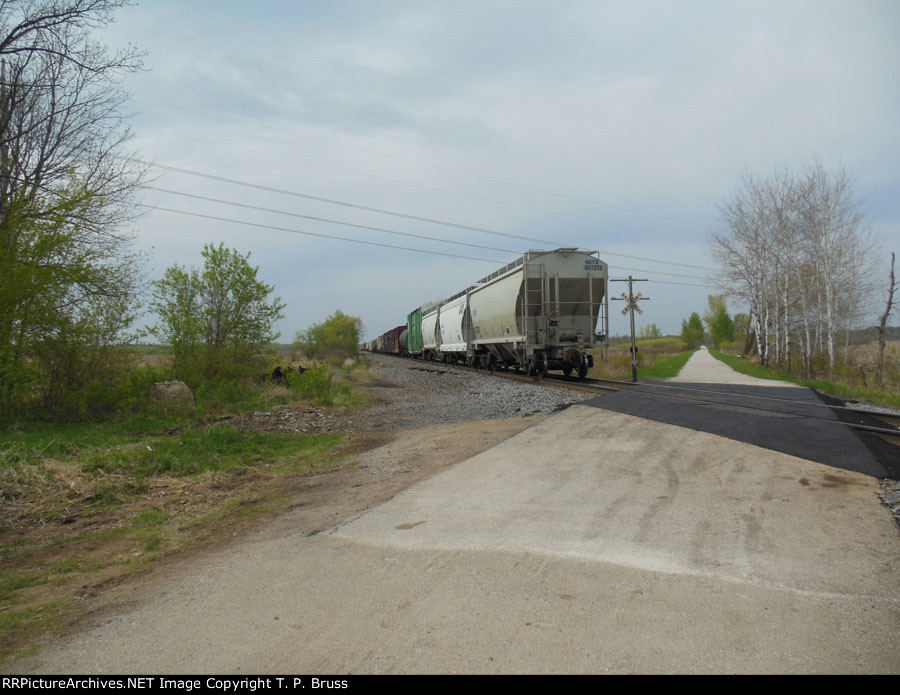 CN through freight crosses the Rat River via former SOO bridge, as seen from the former C&NW bridge on the Wiouwash State Trail, as it heads northwest at Medina Junction, WI on 14 May '14. Train had nine locomotives, CN 2845, CN 2839, CN 2262, CN 8865, IC 2462, CN 2644, CN 8925, NS 6691 (partially visible on left), and NS 8761 (out of frame to left). The bridge is difficult to see from this angle, but it is under the 4th and 5th locomotives.