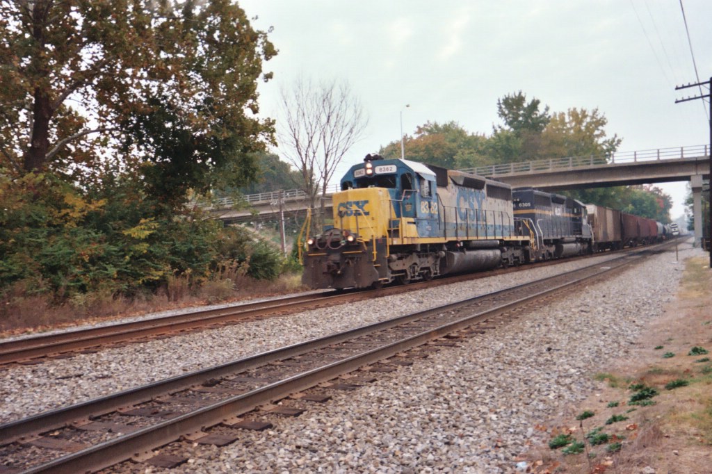 Back at the Priceton Depot, we see an ex-CR now CSX SD60 8719 roaring south at 50 mph on the head end of a mixed freight.