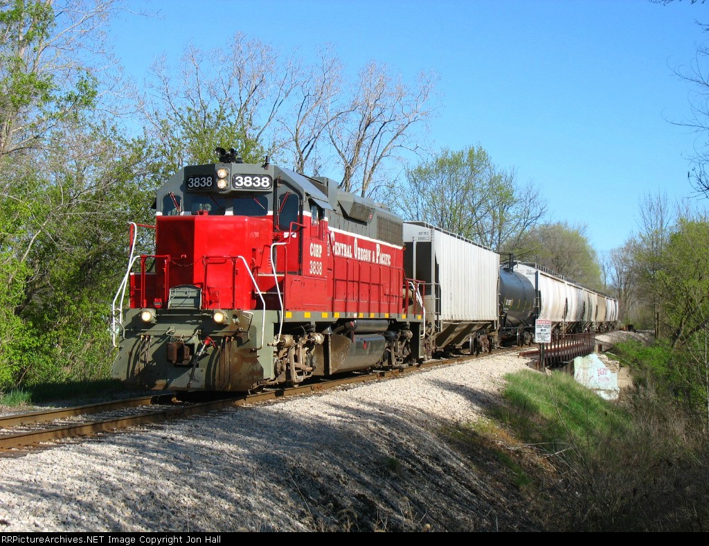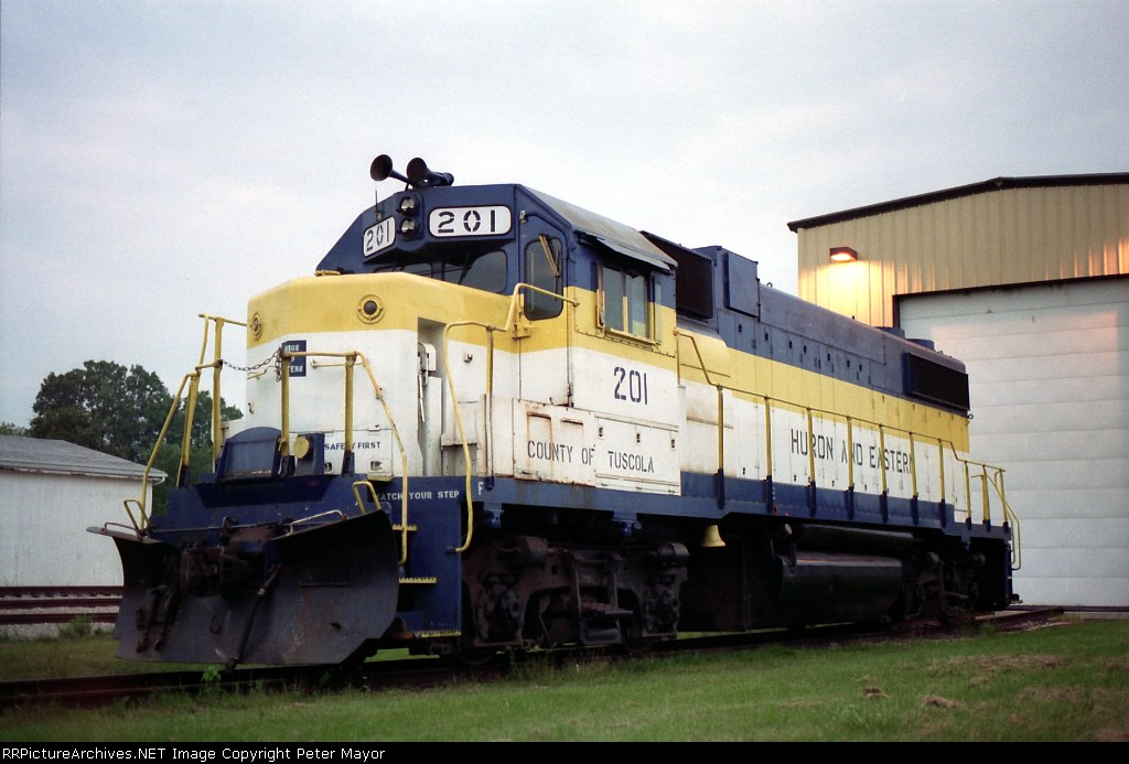 The Bluewater "Caro Pumpkin Festival" excursion train is seen crossing the Cass River, Vassar, MI, October 1998! Huron & Eastern GP38-2 is painted in the original RailAmerica paint scheme! Photo ID #4516282 shows loco #204 in fresh RA paint the next year! (Canon AE-1 35mm camera, Kodak PJC 1600 print film)