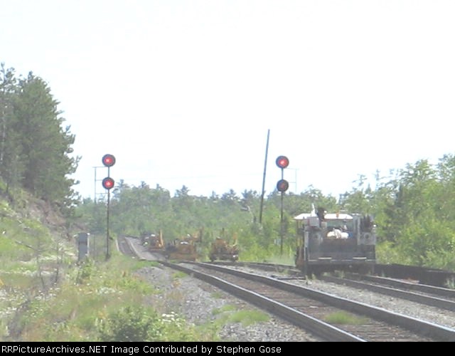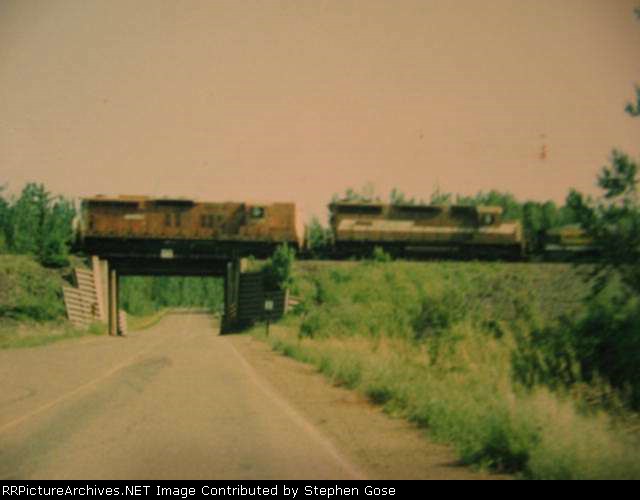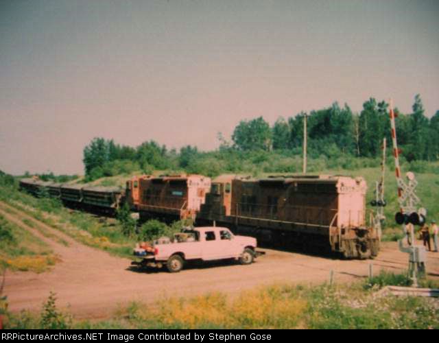 Phaze IV SD9 #1225 and SD28 #1236, crossing over County Rd 4. NSM was running 2 short tails train consists this particualr week. 1 train had the 1225 and 1236 for power, while the other one had the 1226 and 1231. 1225/1236 were coupled at the north end of the side dumps, and the cab at the other end. The train with 1226/1231, was set up the opposite way. This was back in the days, when NSM was almost constantly experimenting with the tails train consist. I remember how fun it was for me to watch them and listen for them on the scanner, and then run up to the track to check things out. Date listed not correct. Although it is the sumer of 1995. Sorry for the blurry scans. Just temporary, until I can get some better scanning.