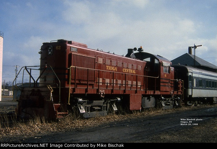 An early October morning finds TV 301 heading west at Hiawatha Rd in Owego, passing signal 233-1, which wouod be removed when the new radio alarm detector was installed at Tioga Center a few years later. If you look closely, you can see the extra light below the main head. This light diplays "hot box" if the detector at Campville, MP 230, gets a hit on a hot axle, and would set the signal red. I only saw it happen once.
