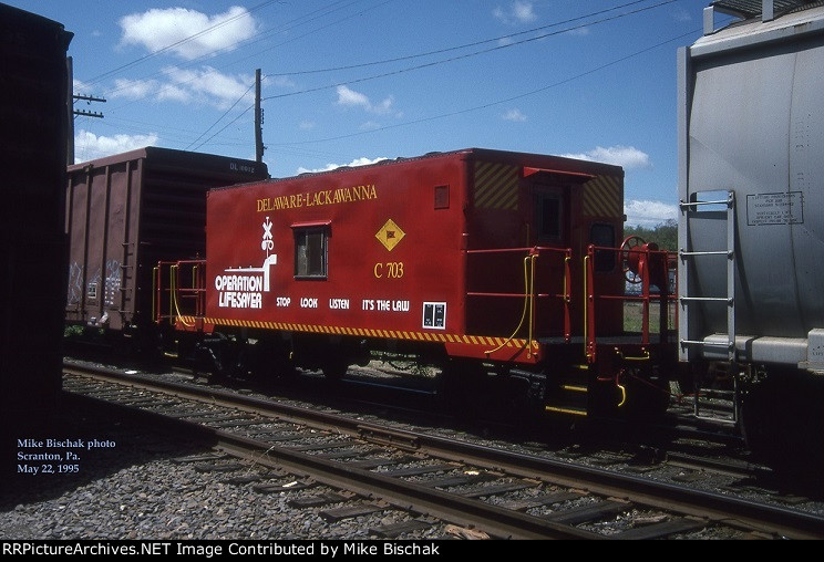 This DL transfer caboose still wears the Operation Lifesaver logo given to it by Conrail. Seen at South Scranton shops.