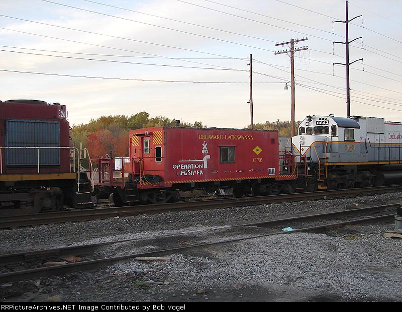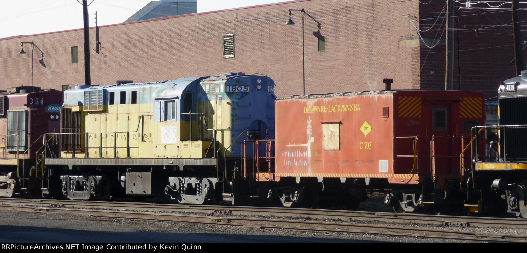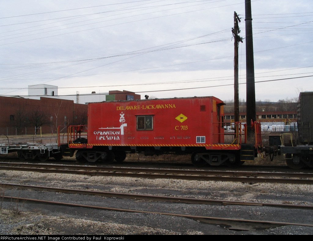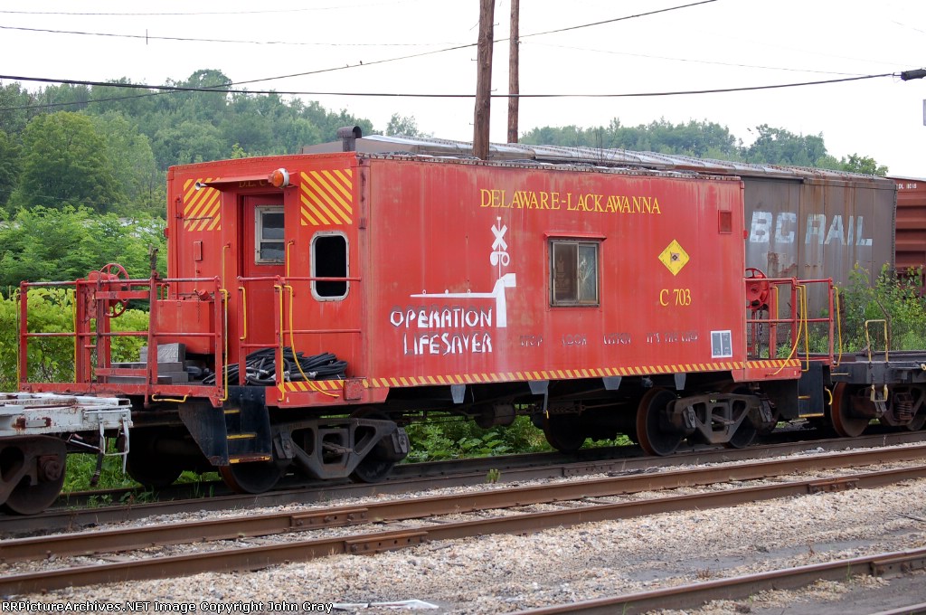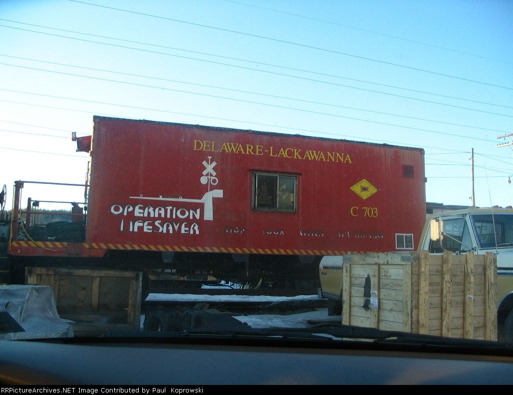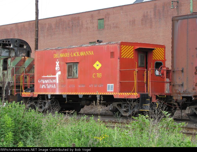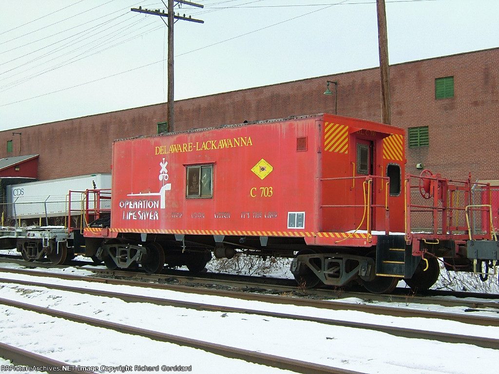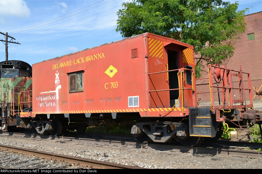Delaware Lackawanna caboose C703 sits near the shops in full operation lifesaver colors, although rather worn now