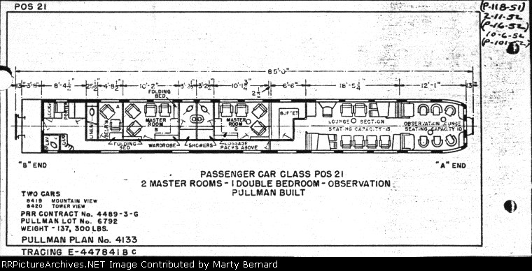 PRR Pullman heavyweight 1 compartment-1 drawing room (1C-1DR) sleeper-buffet-lounge solarium observation #8534 DENVER (Lot #6047, Plan #3975/O/C-1, October 1927), built for assignment to the C&NW's COLORADO SPECIAL, reassigned to the PRR in May 1932, sold to the PRR at the 12/31/1948 Pullman divestiture, retired in January 1952. Scanned with an Epson V550 from a duplicate Ektachrome 35mm slide.