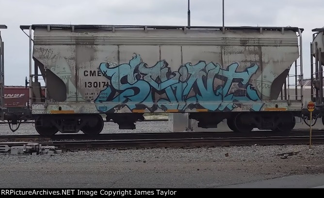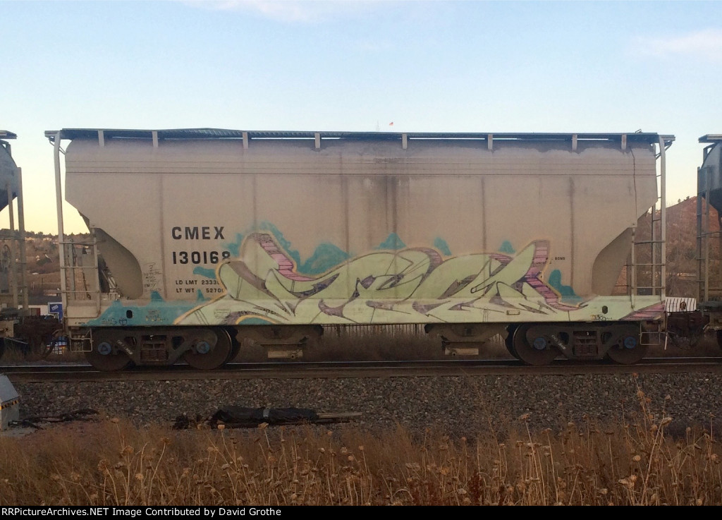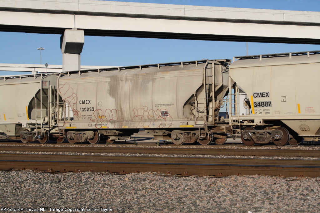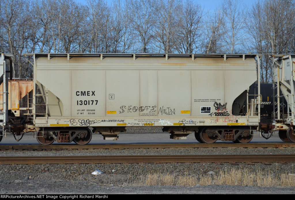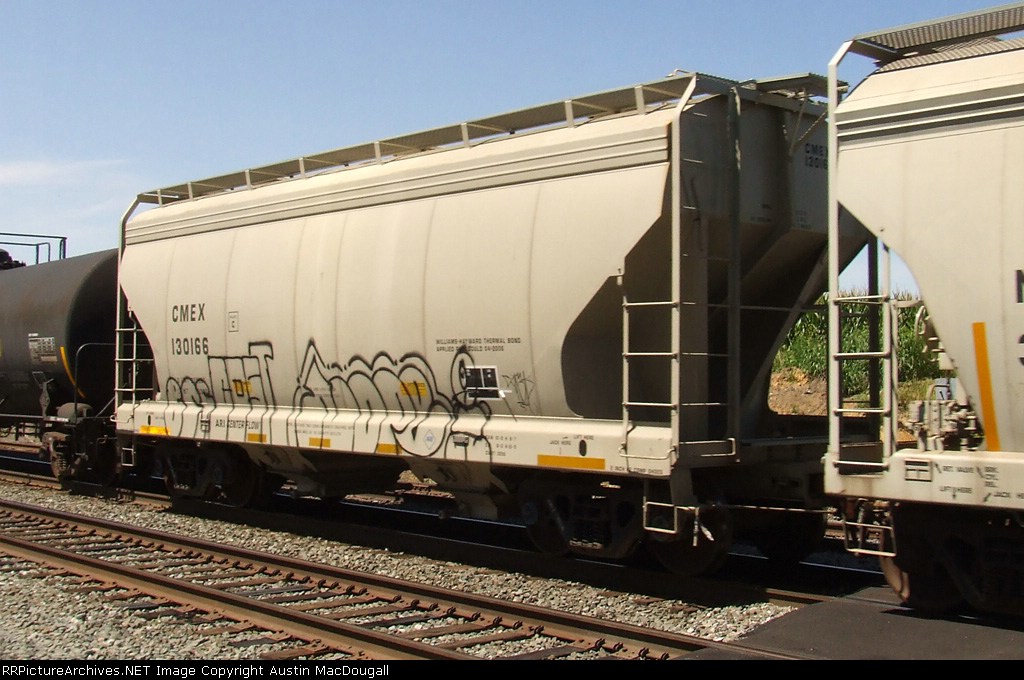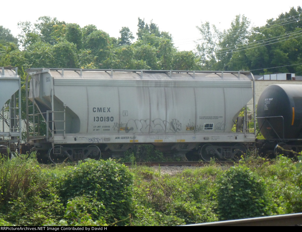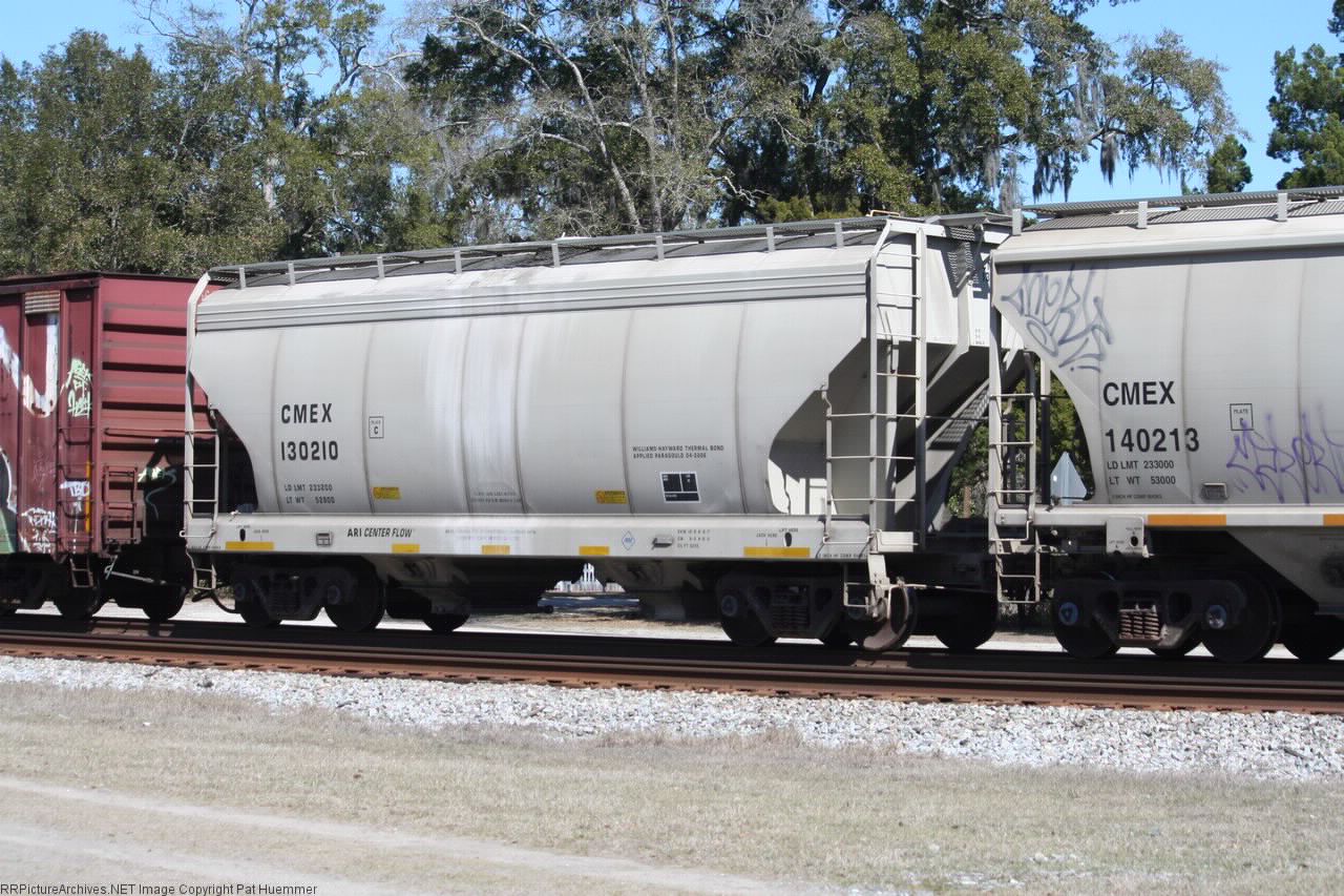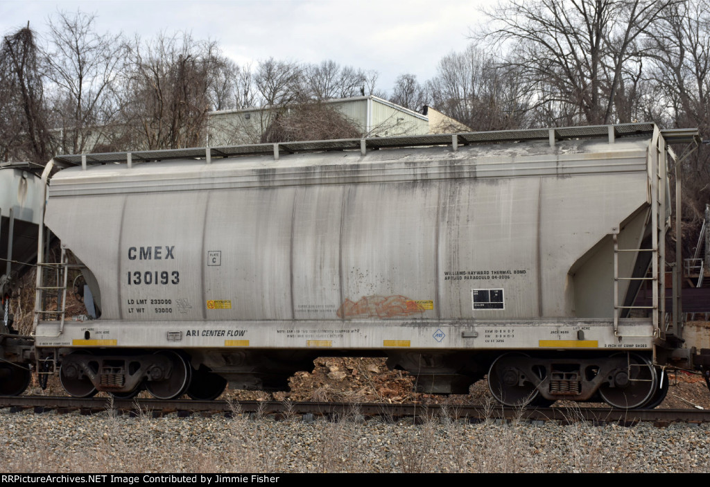 Asheville, NC, Feb 21, 2016, 10:58am: CMEX 130193: Cemex, Inc, covered hopper, 2-bay, for bulk cement service. Light weight: 53,000 pounds. Load limit: 233,000 pounds. Capacity: 3,256 cubic feet. Built April, 2006, by American Railcar Industries.
