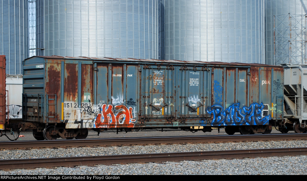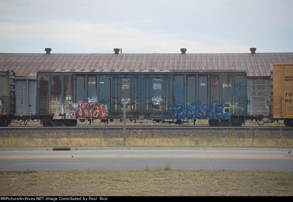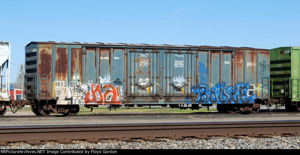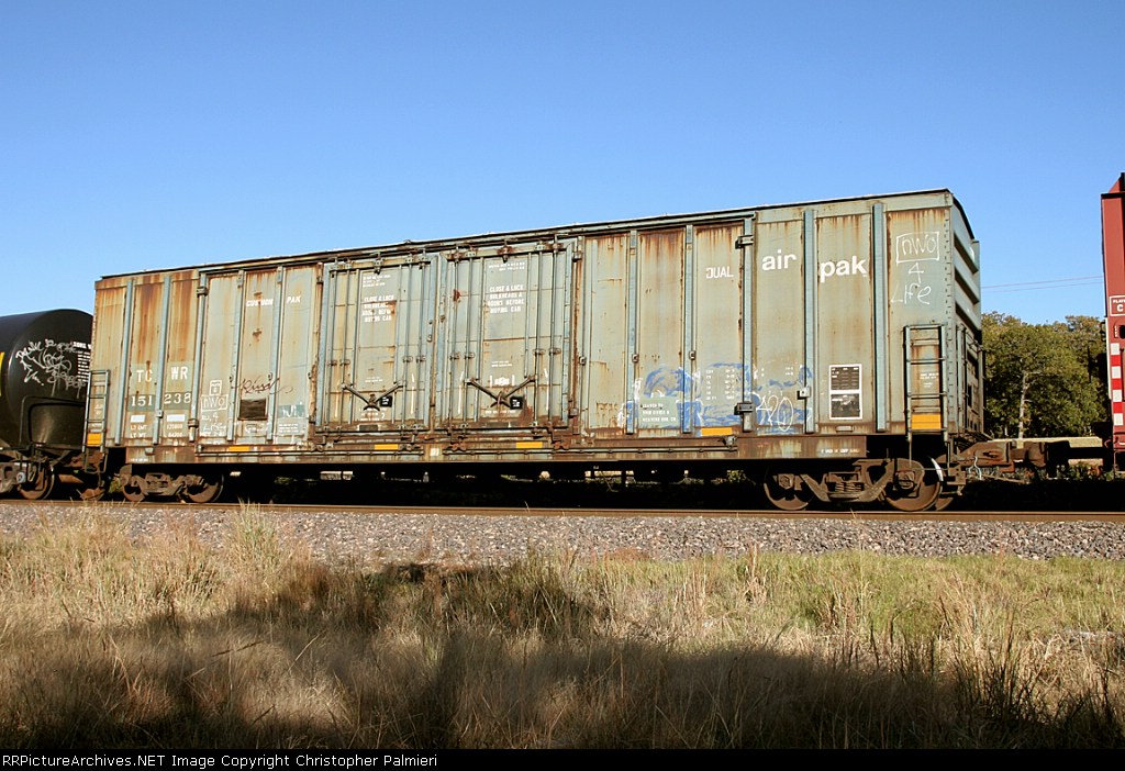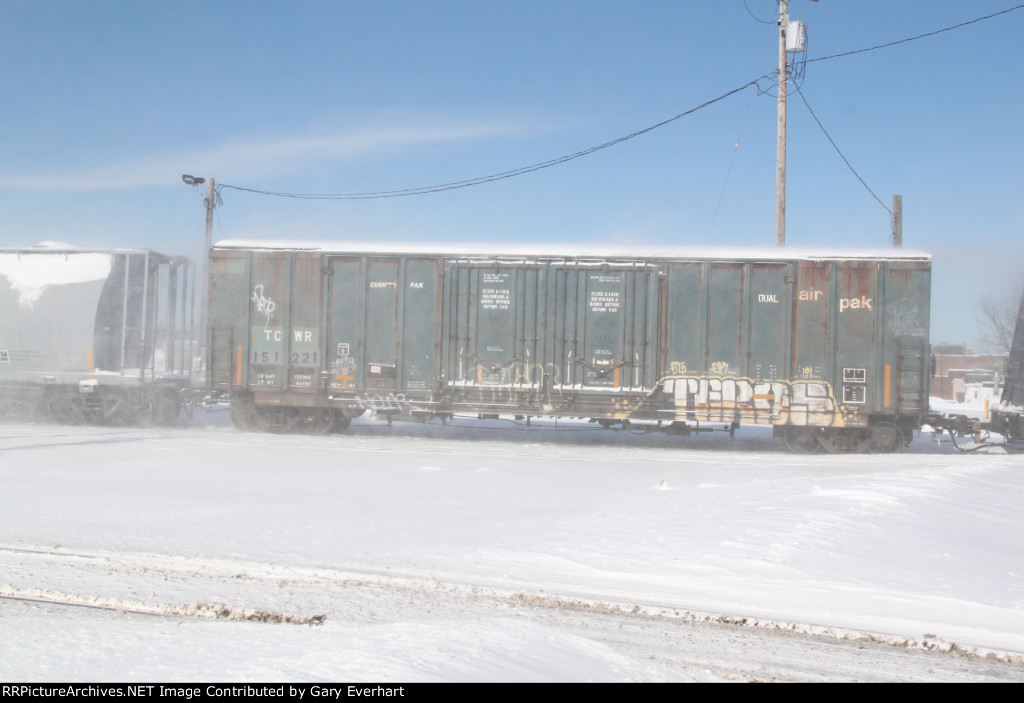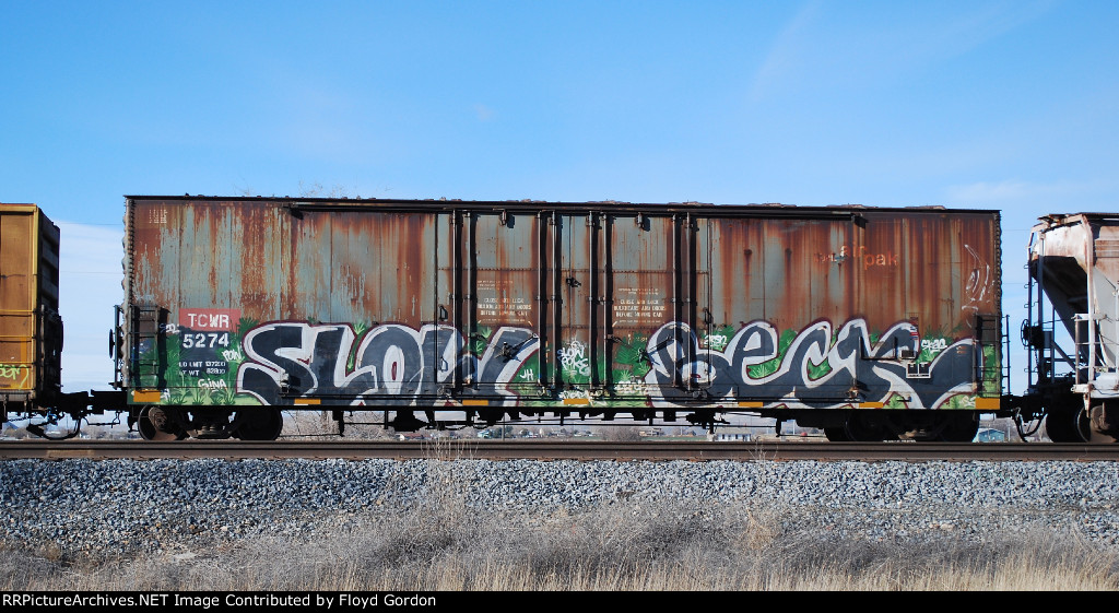The yard crew has attached this Twin Cities & Western boxcar to the rear of a departing train on the main line. Soon the air line will be connected and once the brake pipe is pressurized all will depart. Parked in UP Miller Yard South Dallas.