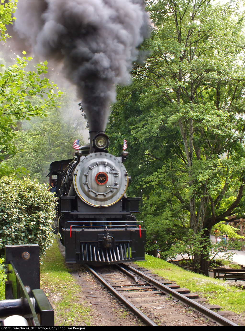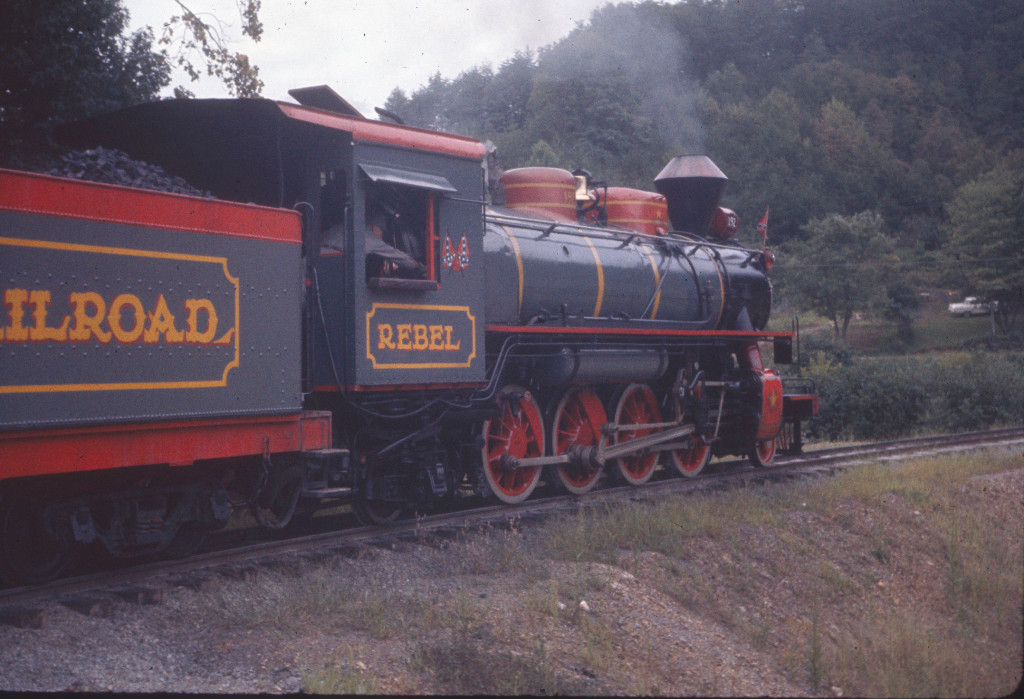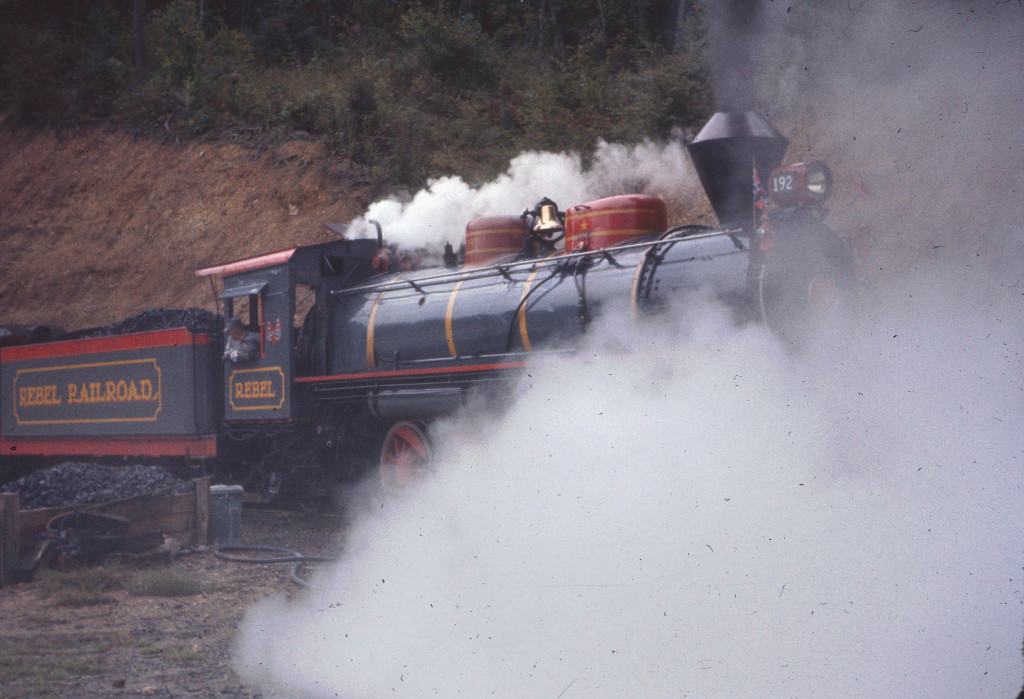 Rail fan Jim Lockart stopped by the Dollywood Park at caught former White Pass & Yukon 2-8-2 narrow gauge #192 now serving as the tourist train in the park. Known as "Klodike Katie", it is a 1943 Baldwin built 2-8-2 Mikado that operated on the 36-inch narrow-gauge White Pass & Yukon Route in Alaska to transport supplies for the Alcan Highway. It was purchased by White Pass & Yukon Route in 1946; converted to an oil burner in the 1950s and used as a switcher. Then in 1960, the loco was purchased by Grover Robbins Jr. in 1960 for the opening of Rebel Railroad in 1961. It remained in service through the park's name changes: Rebel Railroad, Gold Rush Junction, Silver Dollar City Tennessee, and finally Dollywood (1986).