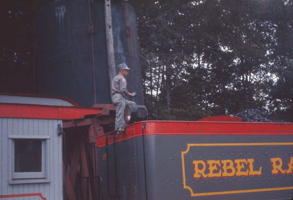 Dollywood Express #70 on 3-foot track gauge. A crew is loading from the old fashion water tank.