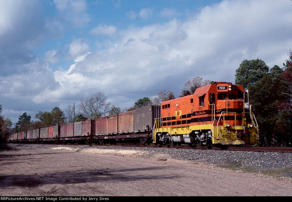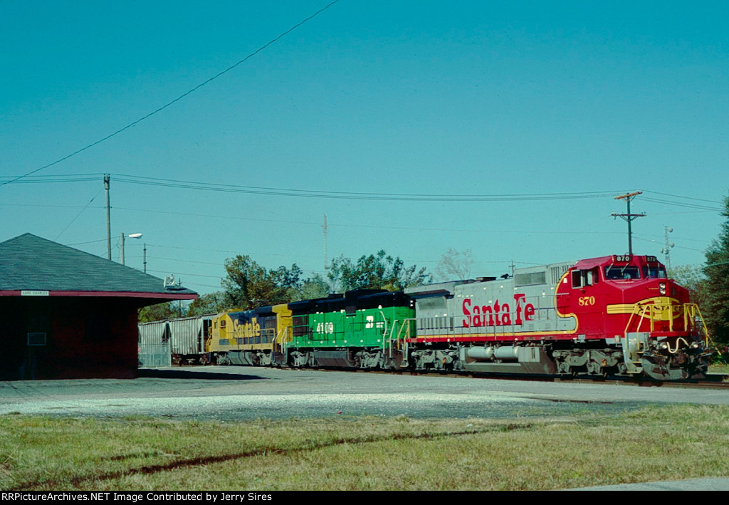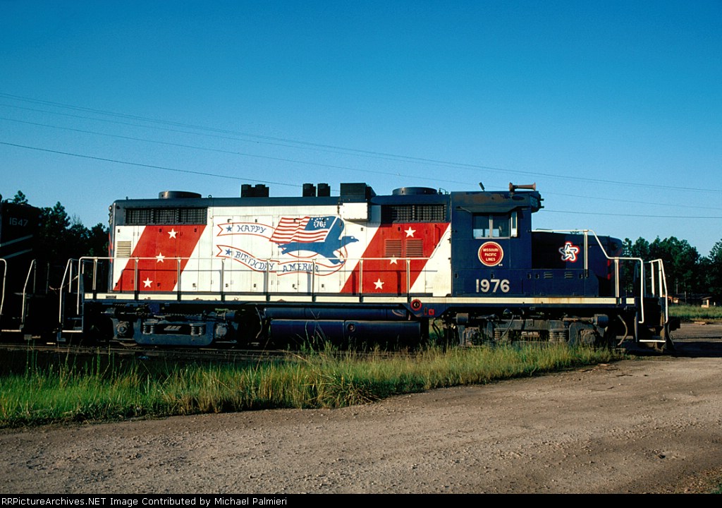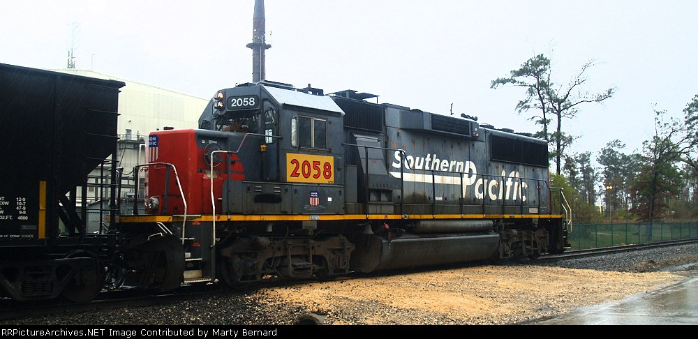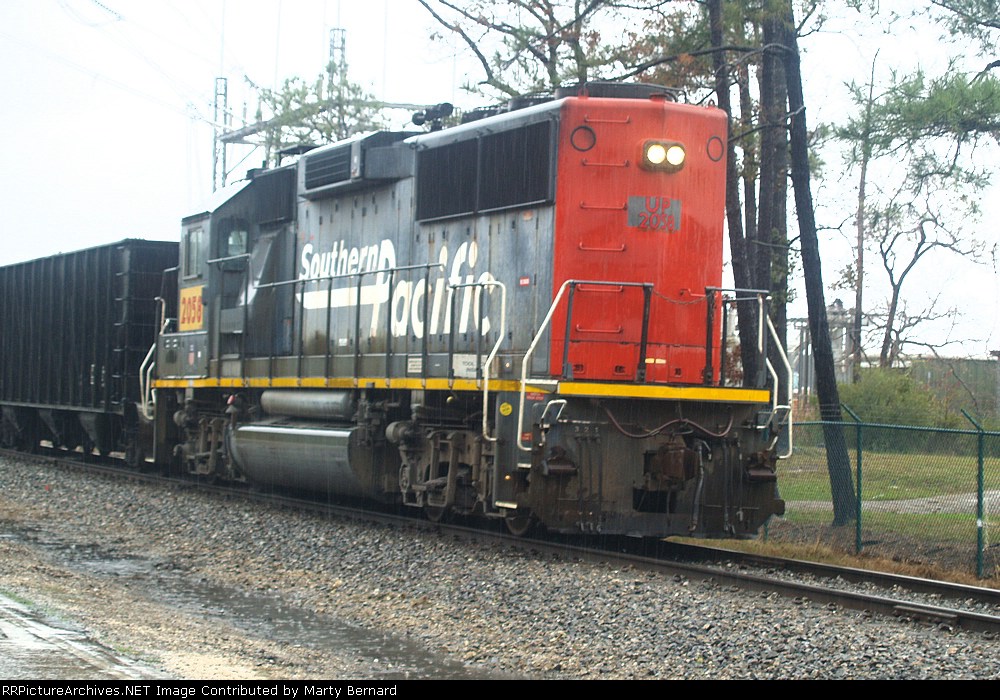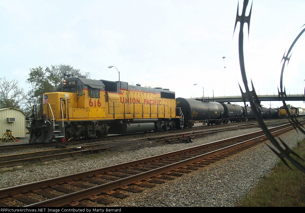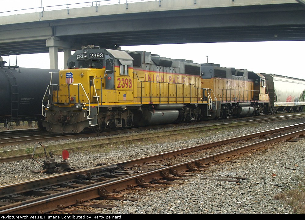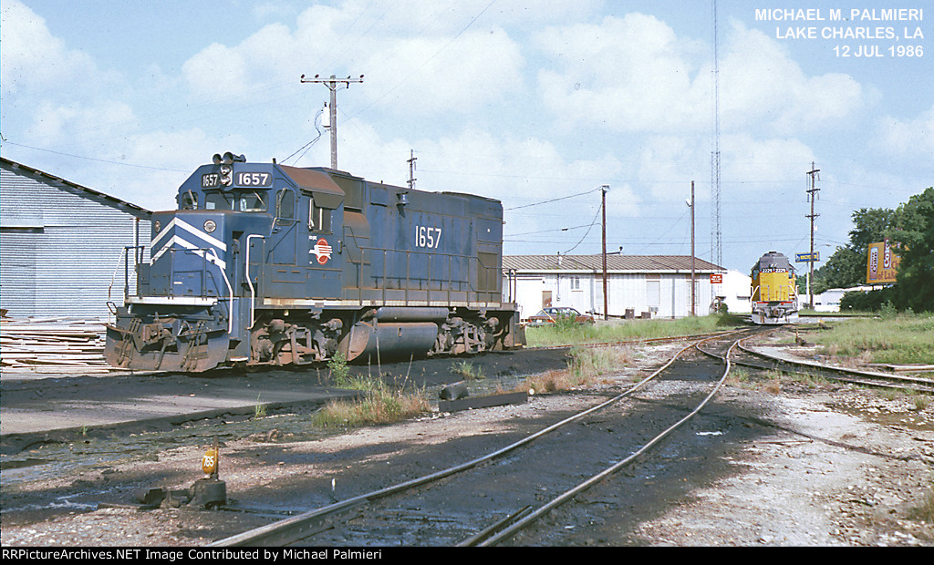 Union Pacific 1375 was wearing a nasty patched paint scheme at Lake Charles, Louisiana on 21 August 2005. It had been built in November 1974 as Southern Pacific 3199, and was one of only three GP40P-2 units (SP 3197-3199) ever produced. This unit had its steam generator removed, received a larger fuel tank and was renumbered second 7602 in June 1985. (First 7602 was a Cotton Belt GP40 that had been upgraded into GP40-2 7961 in February 1982.) SP 7602 was assigned UP number 5274 in September 1997, but not but not renumbered before the railroad’s renumbering plan changed. It was assigned 1374 in December 1999, but was renumbered 1375 in August 2001 because the number 1374 was still occupied by an MP15DC which had not yet been renumbered Y1374. UP 1375 was repainted yellow on 7 October 2007 and upgraded into a GP40N in March 2019.