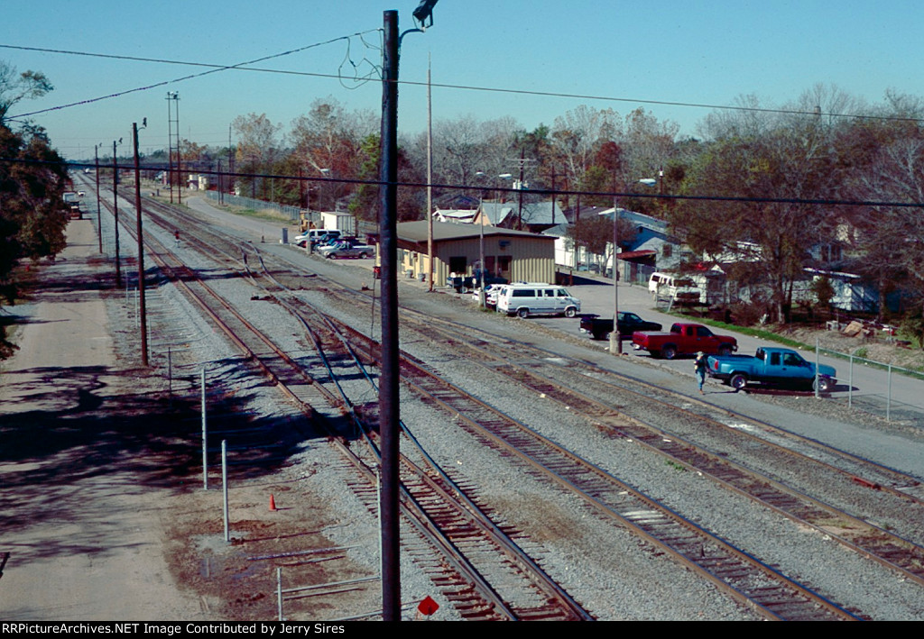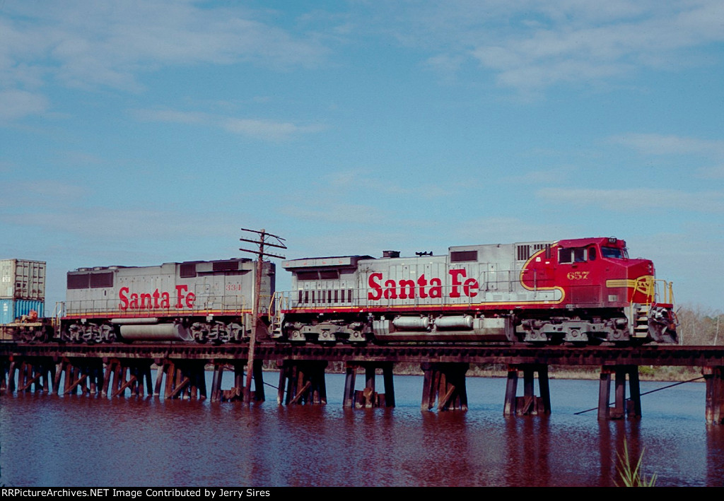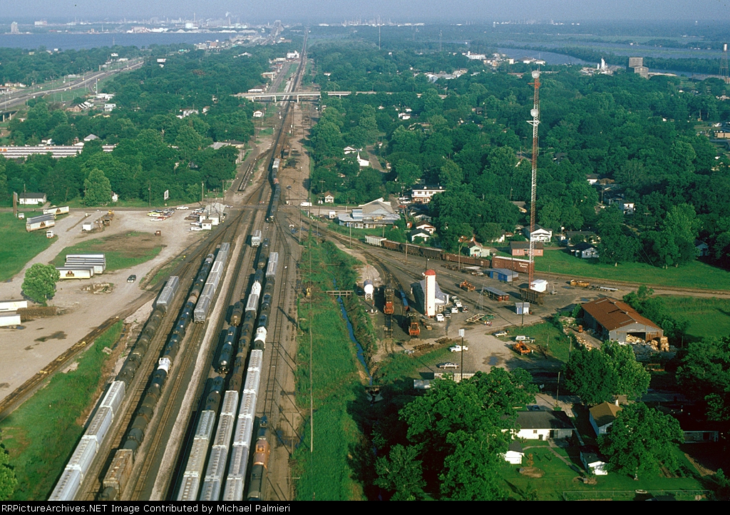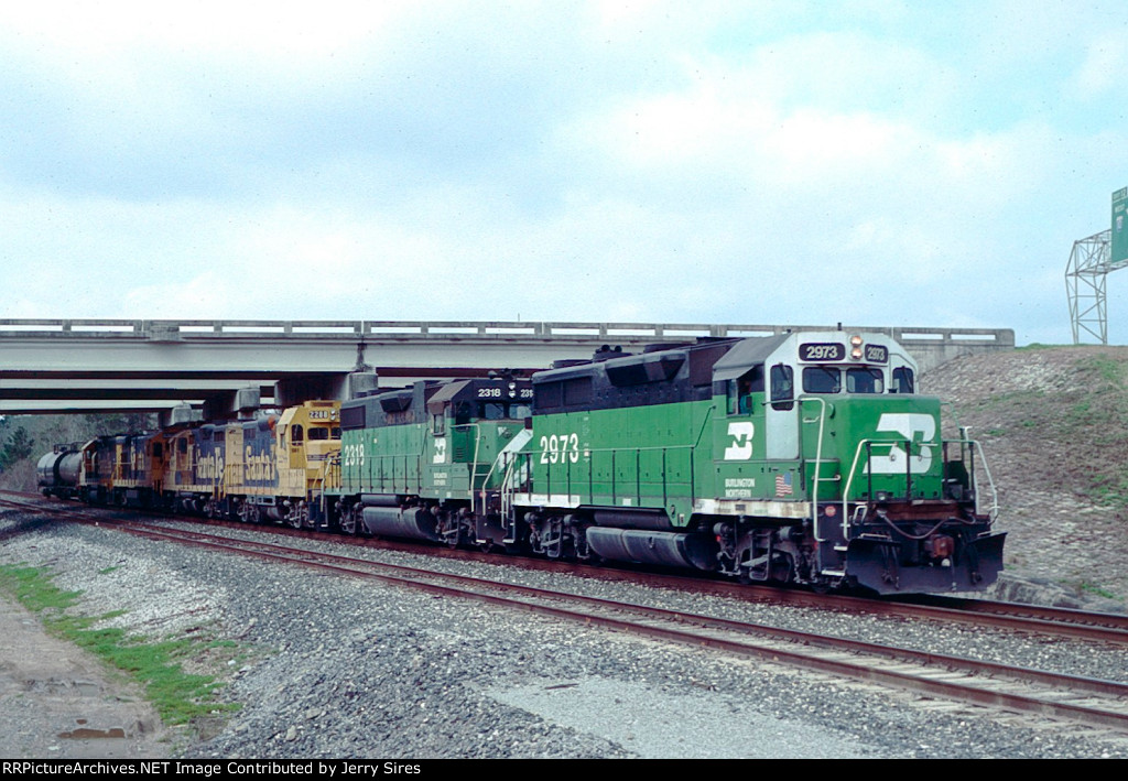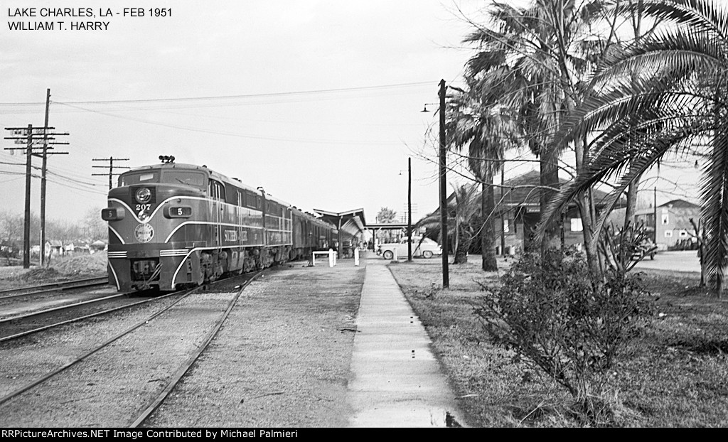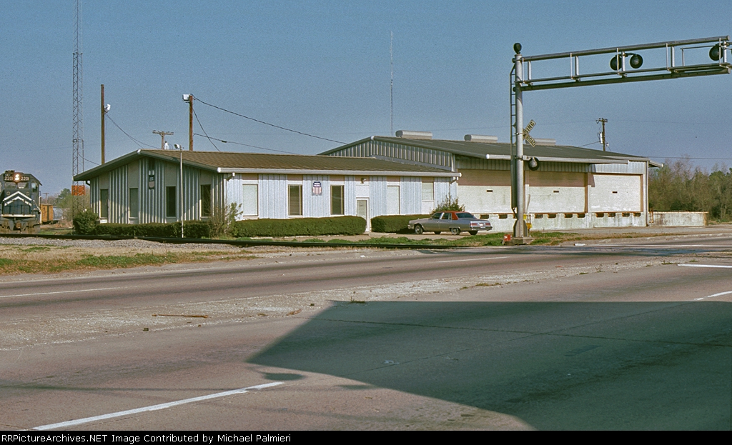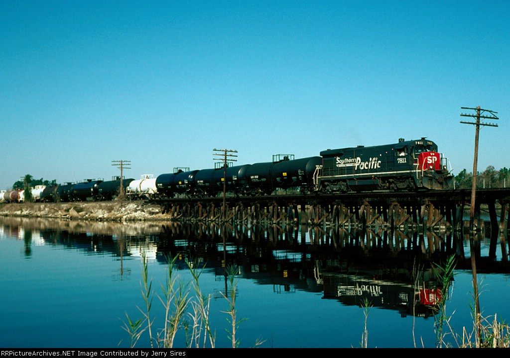 Union Pacific 1375 was wearing a nasty patched paint scheme at Lake Charles, Louisiana on 21 August 2005. It had been built in November 1974 as Southern Pacific 3199, and was one of only three GP40P-2 units (SP 3197-3199) ever produced. This unit had its steam generator removed, received a larger fuel tank and was renumbered second 7602 in June 1985. (First 7602 was a Cotton Belt GP40 that had been upgraded into GP40-2 7961 in February 1982.) SP 7602 was assigned UP number 5274 in September 1997, but not but not renumbered before the railroad’s renumbering plan changed. It was assigned 1374 in December 1999, but was renumbered 1375 in August 2001 because the number 1374 was still occupied by an MP15DC which had not yet been renumbered Y1374. UP 1375 was repainted yellow on 7 October 2007 and upgraded into a GP40N in March 2019.