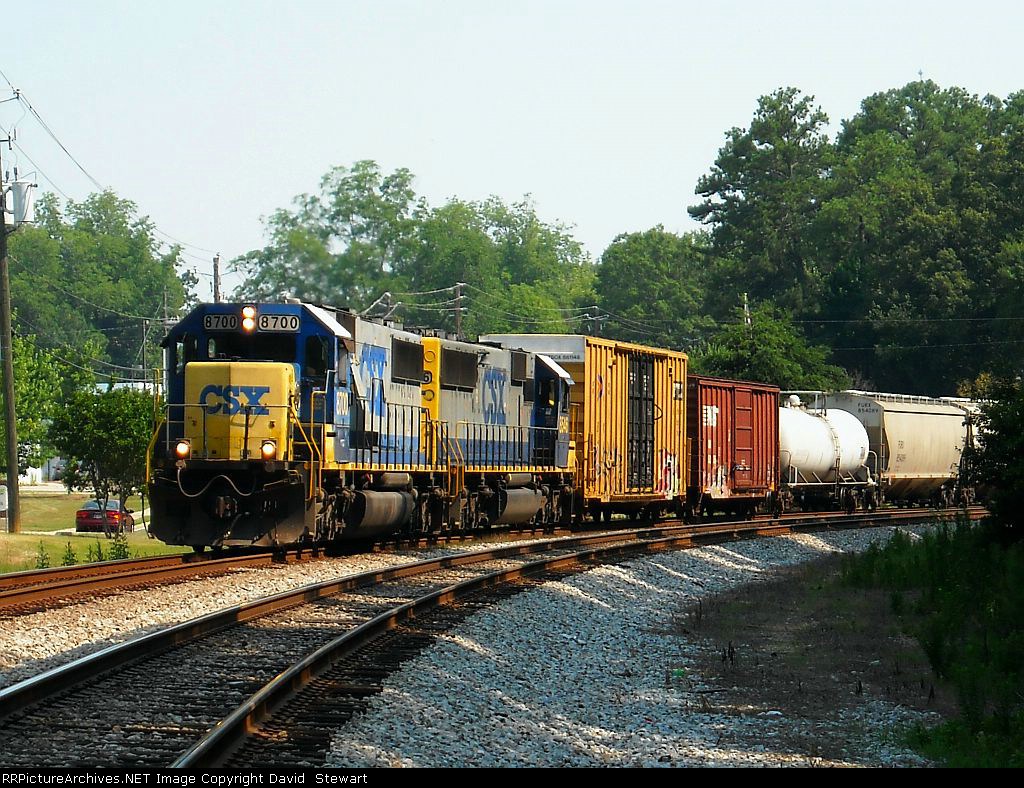 The Union City Turn job A727 is seen as it rumbles down the siding in Union City at 10:50 where it will hold untill Q142s passing. The CSXT 8700 is the first of the original ten SD60s purchased by the carrier.