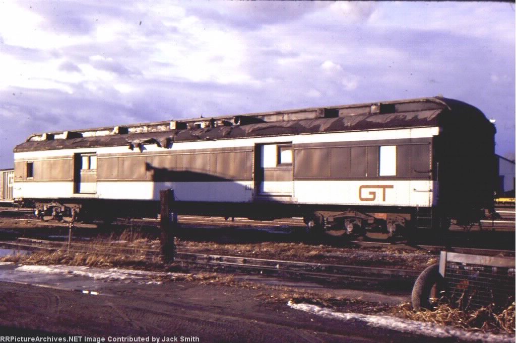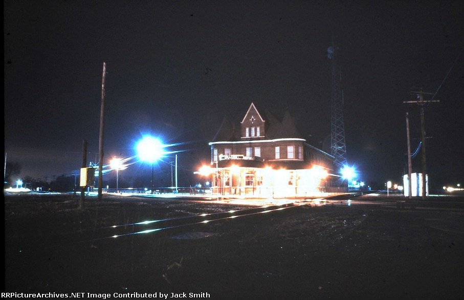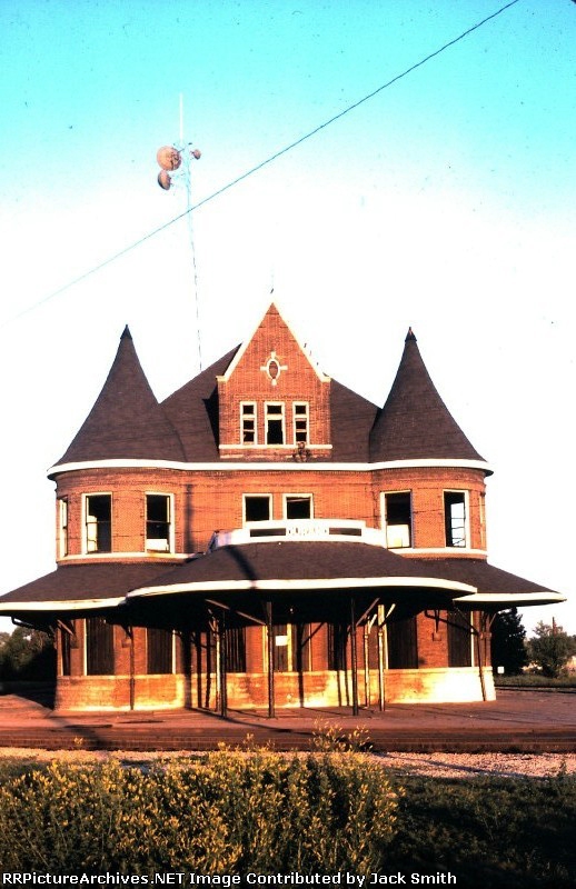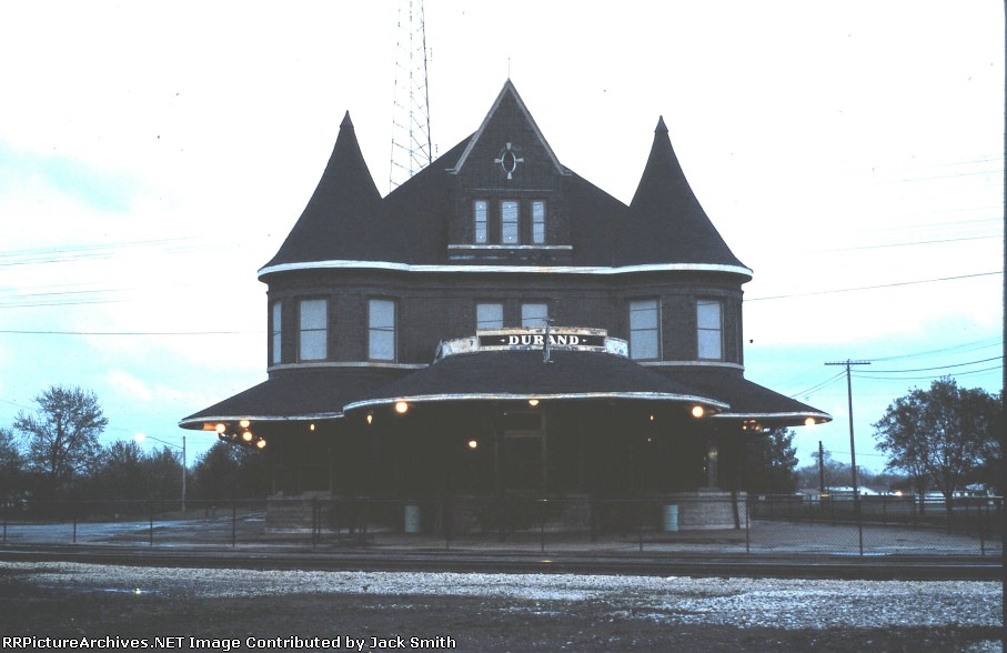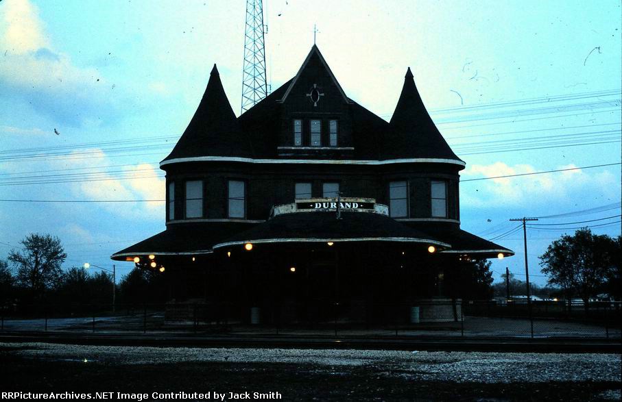 Posed before the impressive Durand, MI, station, this "Pacific" type loco was built in 1912 as a class J-3a with 69" drivers, developing 188.5 psi, had an overall wheelbase of 62.29', and an engine wt 223,000 lb. No date was listed for this very fragile, damaged photo so an arbitrary date was used.