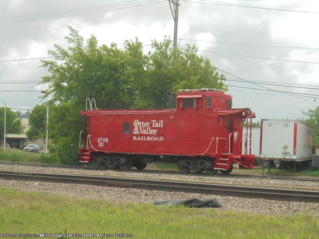 Coupled between freight cars is the Otter Tail Valley RR caboose #101 (ex-ATSF 999196, nee-ATSF 545). Eric Berg took the photo while the caboose sat in the OTVR yard.