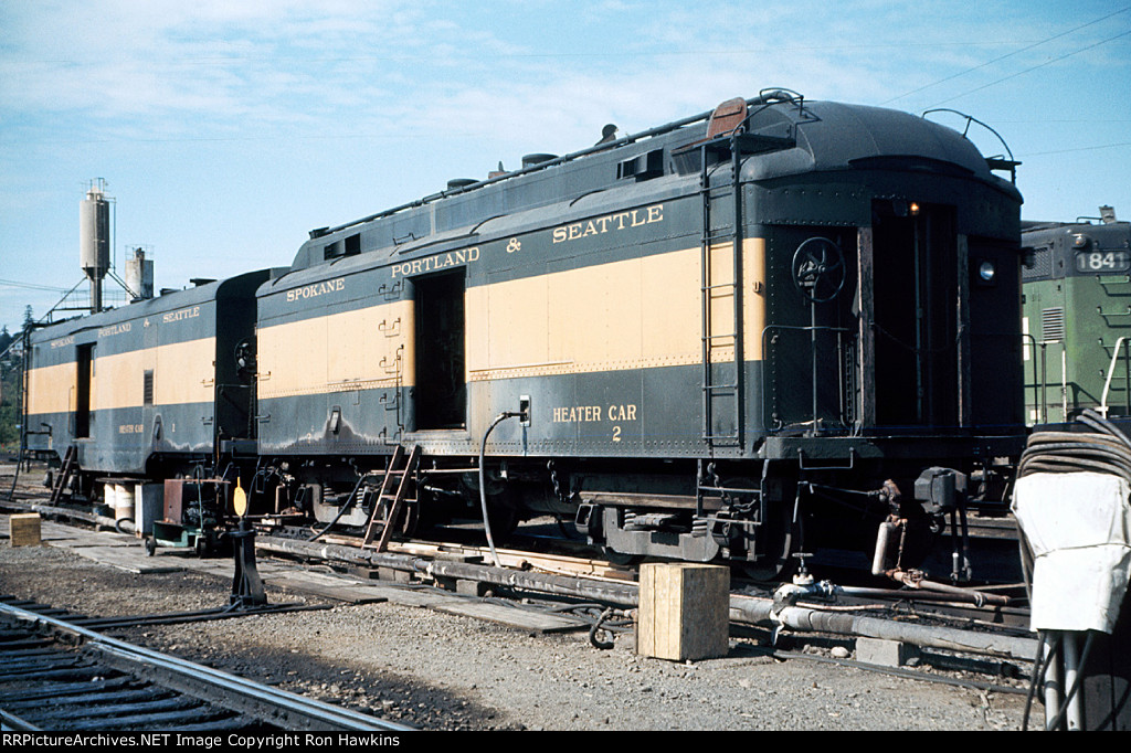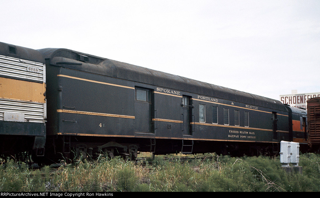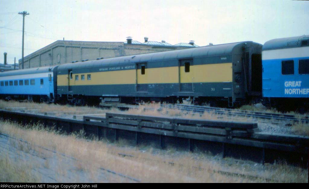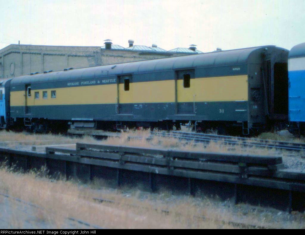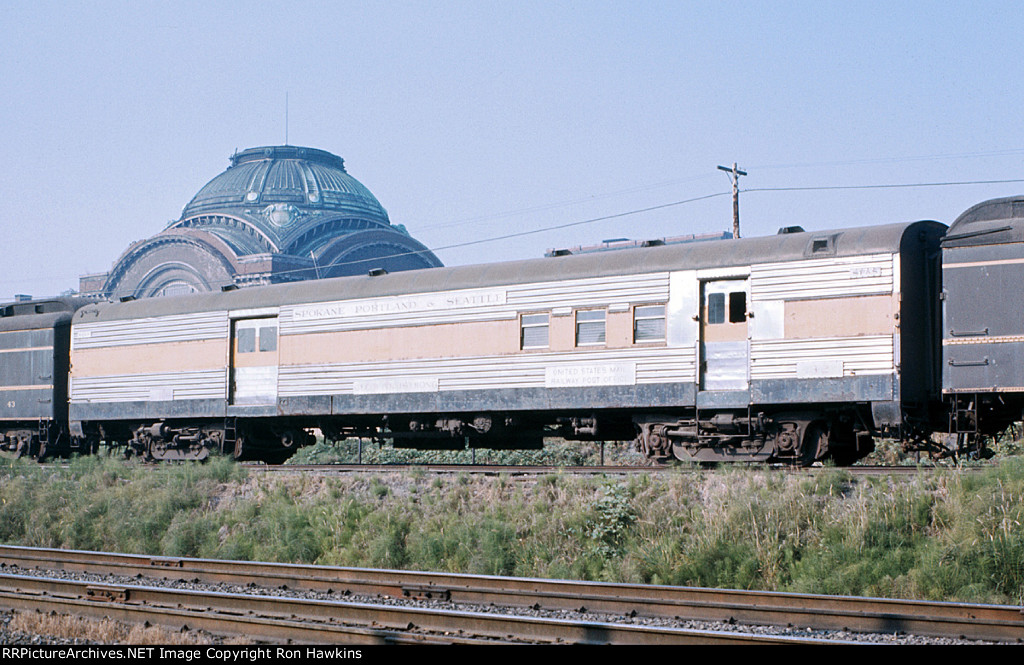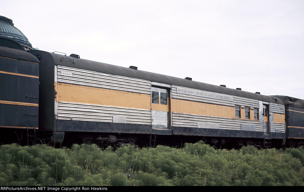 RE-UPLOAD due to missing file. Pullman Plan #3410 12 section-1 drawing room (12S-1DR) sleeper McCLEARY (built in May 1924 in Lot #4763 for the general service pool, retained by Pullman at the 12/31/1948 divestiture, sold for scrap in January 1960 to the Purdy Company), SP&S Plan #4119 8 duplex roomette-6 roomette-3 double bedroom-1 compartment (8DXR-6RM-3DB-1C) sleeper #366 (built by Pullman-Standard in September 1948 in Lot #6781 as the PORTLAND, name removed and replaced by #366 in March 1954, withheld from Pullman lease in October 1968 and redesignated as a dormitory, leased to Amtrak from 1971 to circa 1974, no further info), and a UP Plan #9017 ALPINE-series 14 section (14S) sleeper (built by AC&F in 1954 in Lot #3816, rebuilt to a 44 seat leg rest chair in 1965, and sold to Amtrak in 1971). Scanned with an Epson V550 from an original Kodachrome 35mm slide.